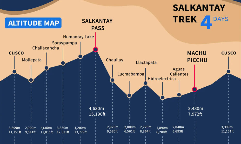 The highest point on the trek is the Salkantay Pass, located at approximately 4,630 meters (15,000 feet) above sea level, where the oxygen levels are considerably lower. This can make even relatively short hikes feel more challenging.