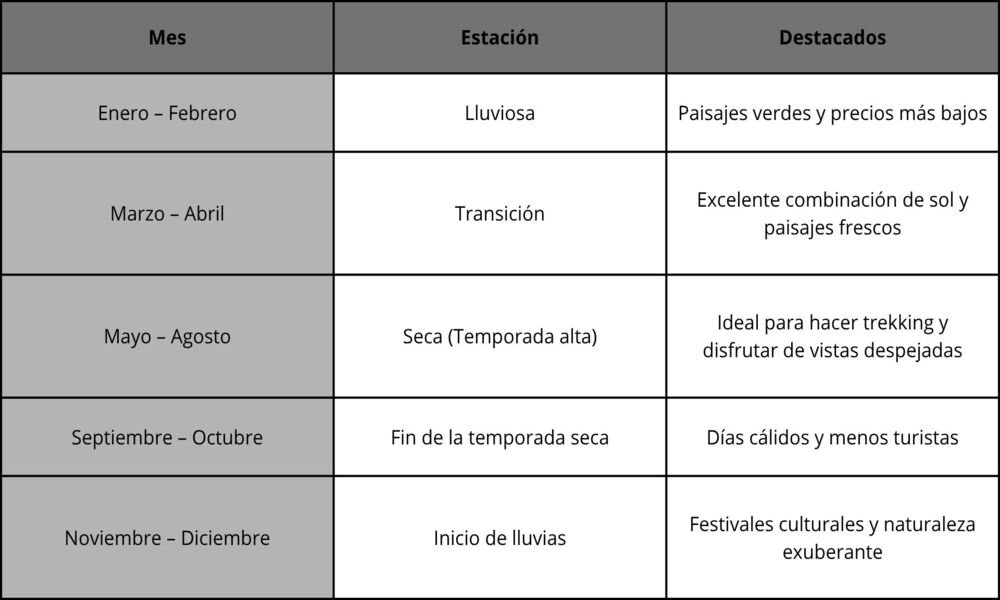 Al planear tu próxima aventura en Sudamérica, surge una pregunta importante y muy frecuente: ¿cuál es la mejor época para visitar Perú? La respuesta depende del tipo de experiencia que busques. El país cuenta con dos estaciones principales: la temporada seca, ideal para disfrutar de cielos despejados y caminatas por la montaña, y la temporada de lluvias, cuando la naturaleza se vuelve más verde y la vida cultural florece. Ambas ofrecen vivencias únicas, desde recorrer el Camino Inca hasta explorar la selva amazónica. Comprender las diferencias entre estas estaciones te ayudará a planificar el viaje perfecto para 2025.
